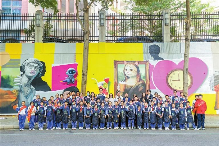 民治街道北站社区玉龙学校,一面长达111米、高4.5米,总面积近500平方米的作品,是本次墙绘活动最大的“鸿篇巨制”。