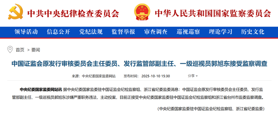 10月10日,中央纪委国家监委官网通报:中国证监会原发行审核委员会主任委员、发行监管部副主任、一级巡视员郭旭东涉嫌严重职务违法,主动投案,目前正接受中央纪委国家监委驻中国证监会纪检监察组和浙江省台州市监委监察调查。