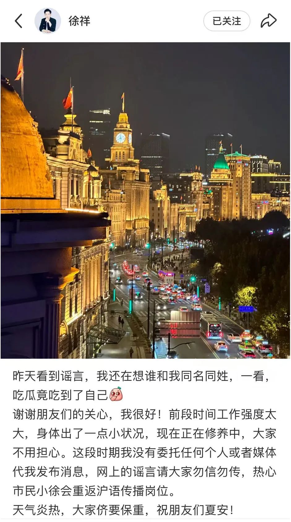 前段时间工作强度太大,身体出了一点小状况,现在正在休养中,大家不用担心。这段时期我没有委托任何个人或者媒体代我发布消息,网上的谣言请大家勿信勿传,热心市民小徐会重返沪语传播岗位。