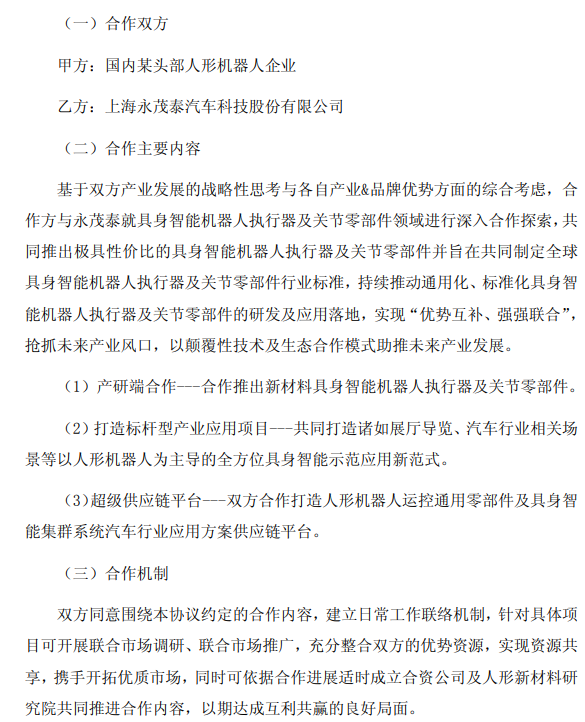 10月17日,永茂泰(605208.SH)公告称,公司与国内某头部人形机器人企业签订《战略合作框架协议》,双方将基于产业发展的战略性思考与各自产业&品牌优势,在具身智能机器人执行器及关节零部件领域进行深入合作探索,共同推出相关产品并制定行业标准。