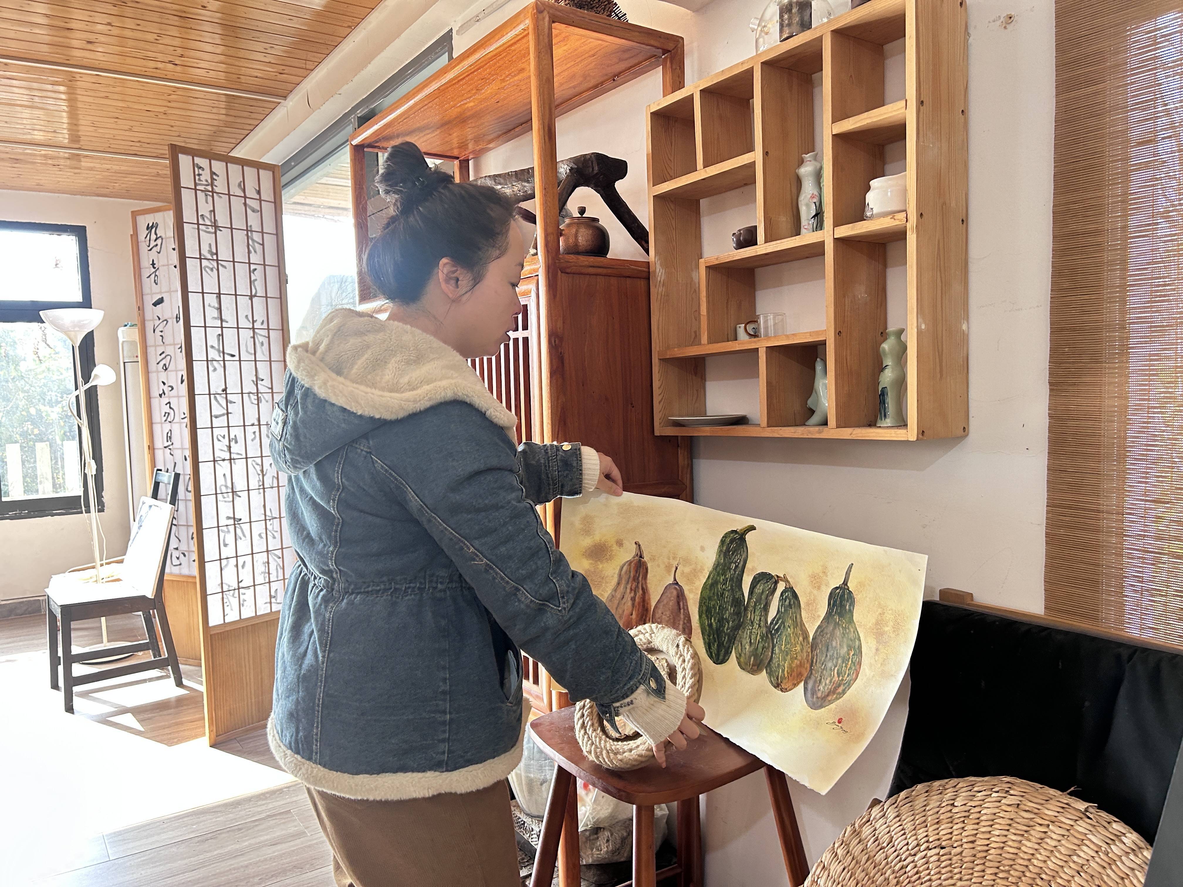 前不久村里南瓜丰收,林一蓓以之为主题创作的画。新华社记者 熊翔鹤 摄每逢节假日,前来学艺的人们围坐桌边,色彩碰撞,丝竹环绕,艺术氛围满满。林一蓓告诉记者,她主攻的岩彩画使用的是矿物颜料,与水墨、油彩不同,岩彩的肌理独特、颗粒感更强,比如中国古代的彩绘陶画、石窟壁画,是中国传统绘画的典型代表。